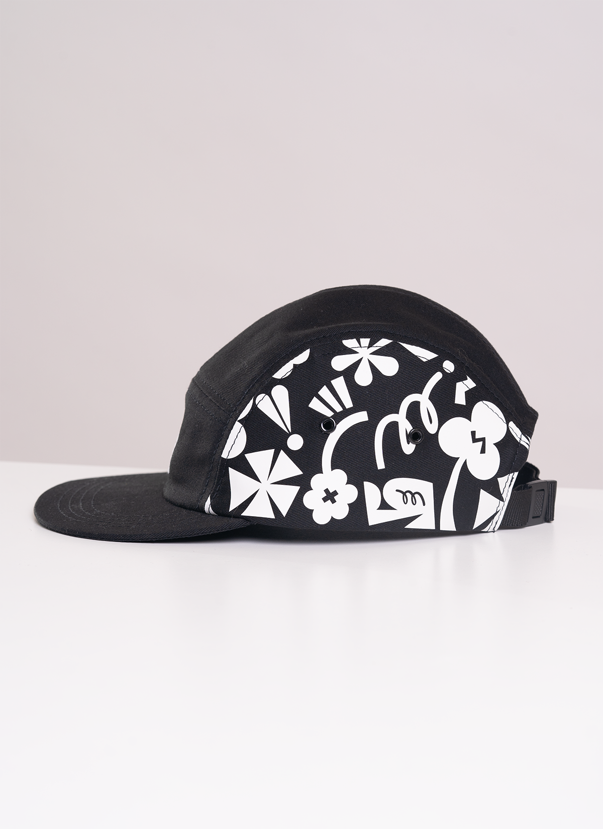 Five panel negro de gabardina con detalles especiales como la aplicación de estampado blanco mate sobre gabardina, broche de cierre y etiqueta interior.